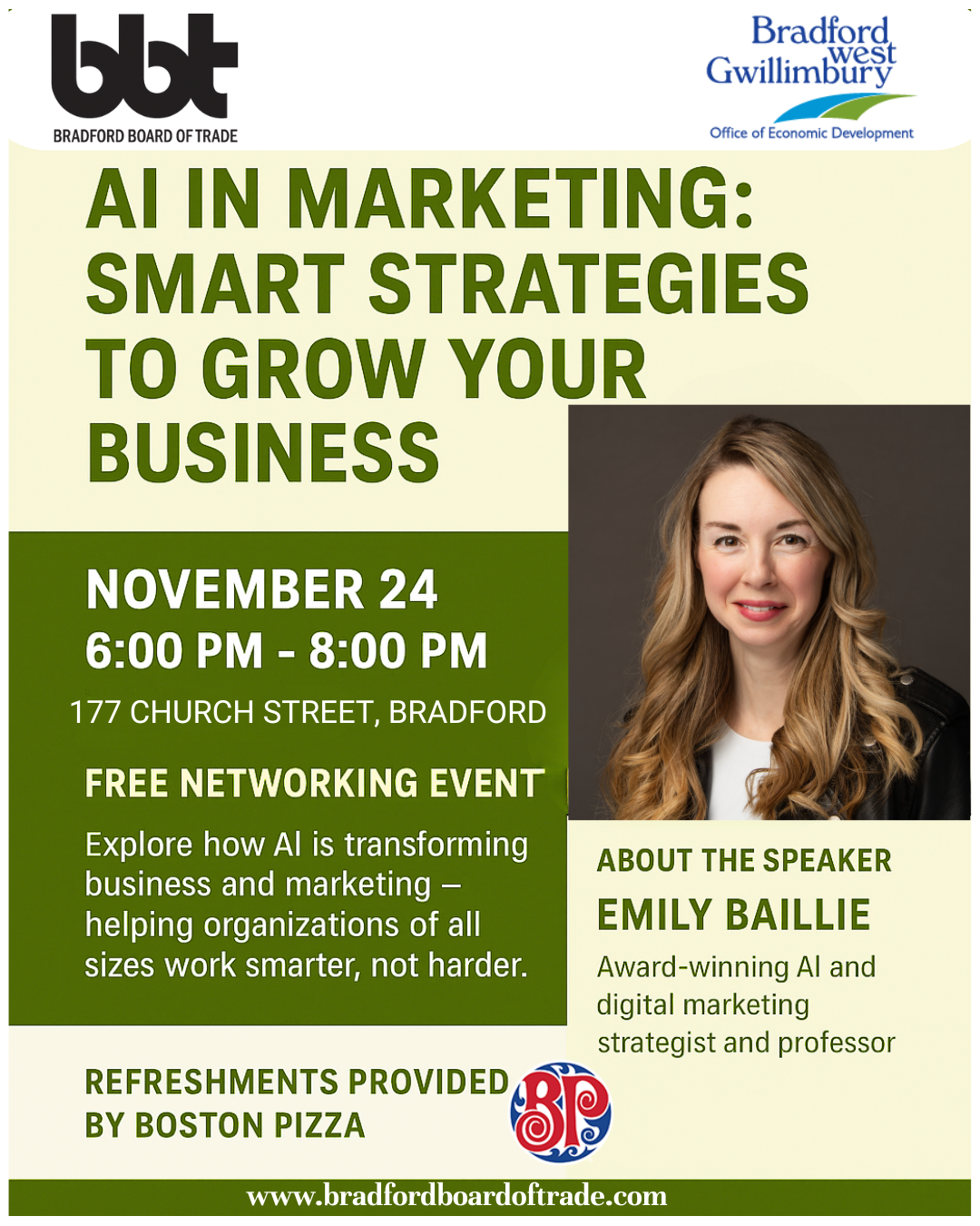 Through her workshops and speaking engagements, Emily helps organizations across Canada use AI and digital marketing tools to save time, boost productivity, and keep the human touch at the centre of their work. She is also a professor of digital marketing at McMaster University and a trusted educator known for making complex topics clear, practical, and engaging.